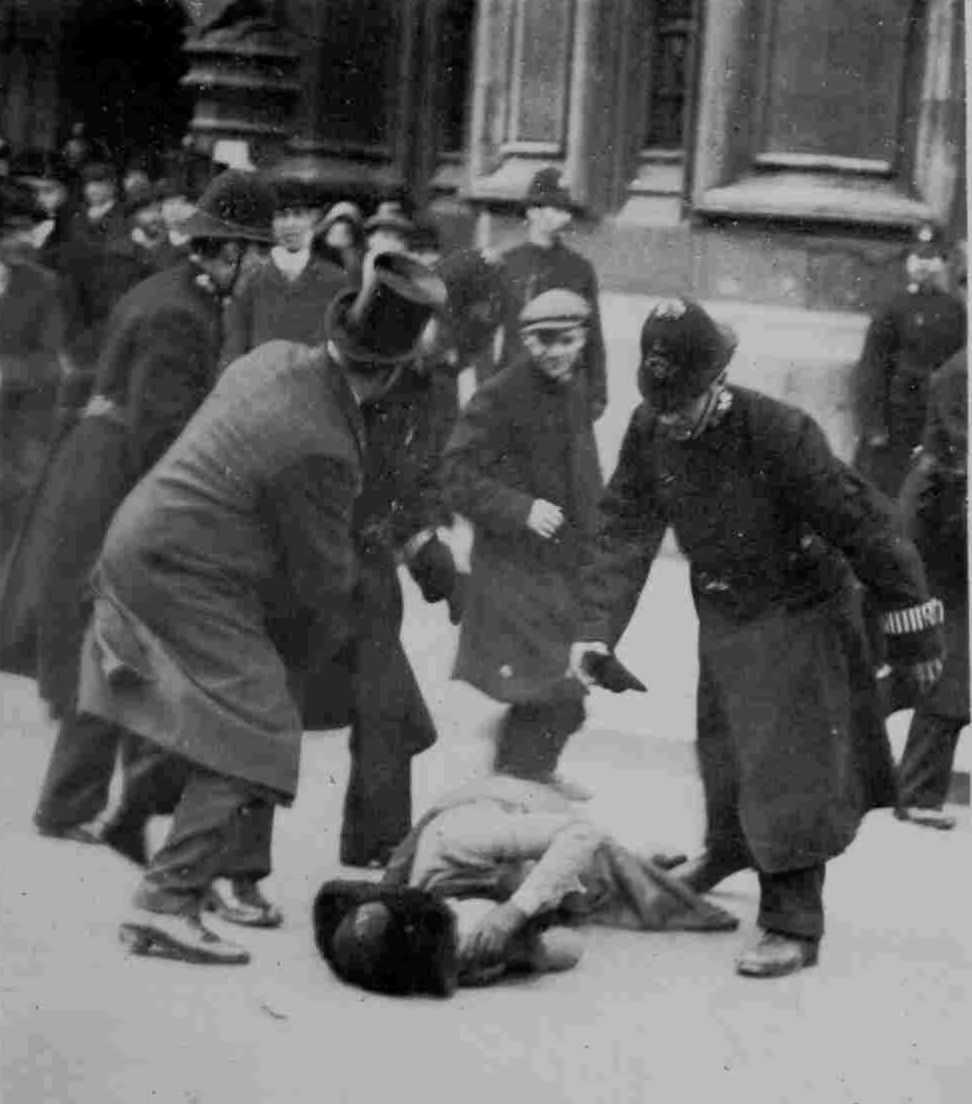 The government’s Conciliation Bill, which extended the right to vote to around one million wealthy property-owning women, got its second reading, but the Prime Minister Herbert Asquith said that there would be no more Parliamentary time for the Bill’s final progress through Parliament. Furious at the government’s delay, a 300-strong crowd of Suffragettes who had been holding a conference at nearby Caxton Hall, Westminster marched on the House of Commons nearby. The women set out peaceably in groups of 12 but as they neared the House they were met in Parliament Square by a gauntlet of policemen and were treated more roughly than at any previous protest.