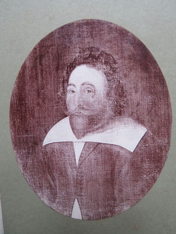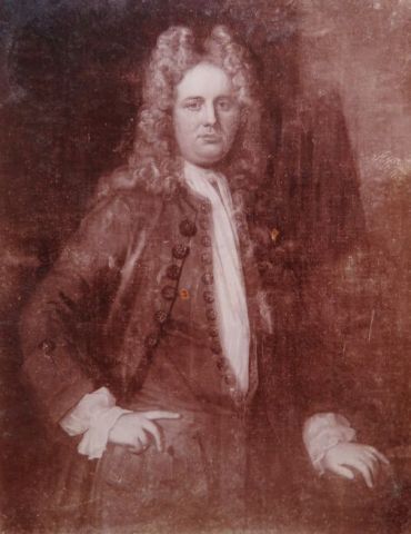 Whilst the first portrait in the album does not have any added notes about its subject it is clearly the portrait of Captain Andrew Branfill (who bought Upminster Hall in 1685) which Wilson stated hung above the fireplace in the Old Hall. This painting can be seen in the background of an engraving on page 187 of Wilson’s 1881 book, and is also in the background of an old photograph in my image collection dating from the early years of the 20th century. This rather crudely executed painting, which is of a man dressed in a style from around the time of Captain Branfill’s birth, seems to have little in common with the bewigged gentleman on the memorial but serves to show how far Branfill had come from his Devonian maritime origins as he earned his fortune and climbed the social scale.