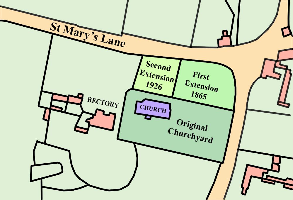 By October 1864, an agreement had been reached with the Rector to buy part of the Rectory kitchen garden, on the north side of the church on the corner of St Mary’s Lane and Corbets Tey Road, 166 feet by 118 feet at its widest. Two Romford surveyors valued the land at £75 plus £10 in compensation for any damage to the Rector’s adjacent land, £85 in total. The land was conveyed to the Burial Board on Christmas Eve 1864 and by 15th March 1865 the churchyard extension had been levelled, ready for use. On Thursday 18th May 1865 the Bishop of Rochester consecrated the new extension.